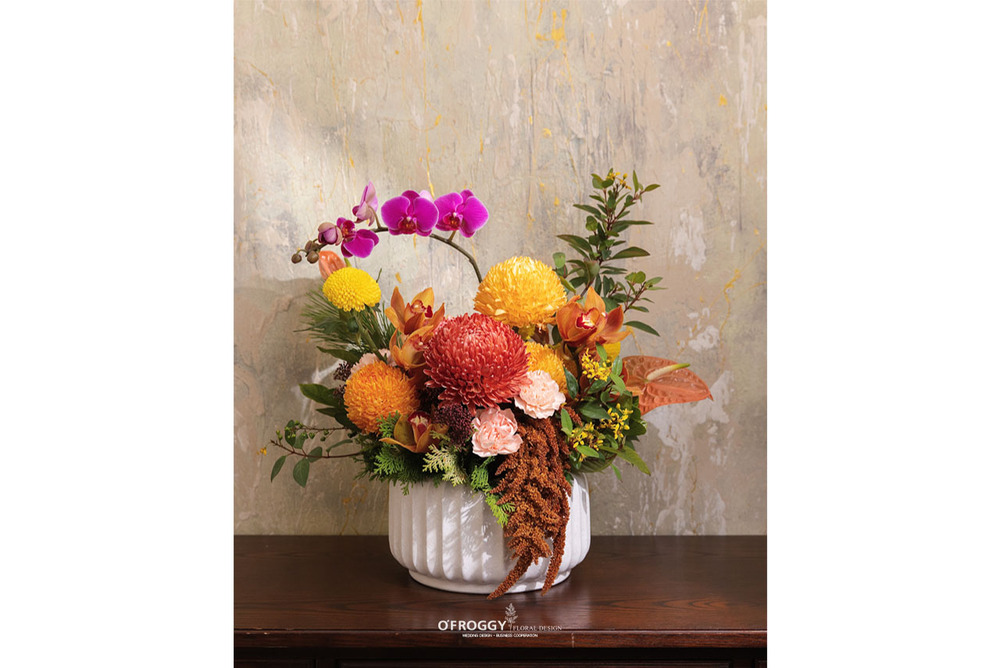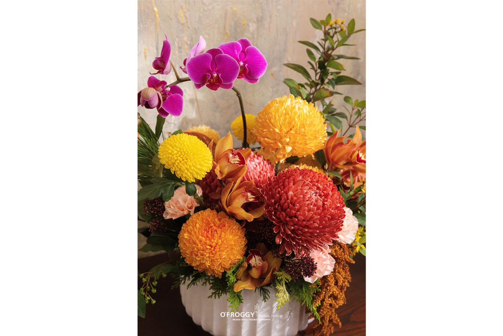 以金黃乒乓菊、橘金大菊搭配暖紅花團,點上紫蝴蝶蘭的高級亮點——