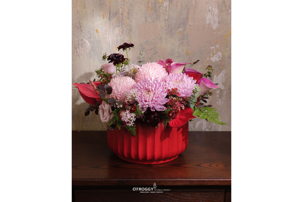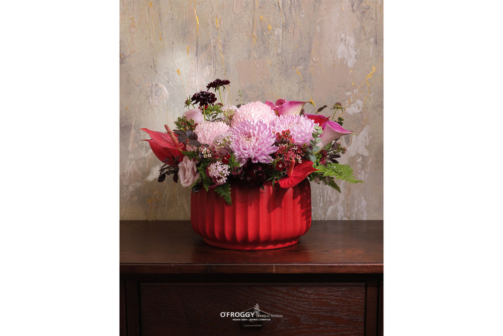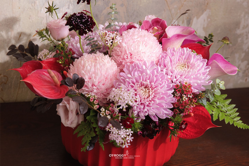 以澎潤桃粉大菊作為主角,搭配酒紅花材與莓果色點綴,