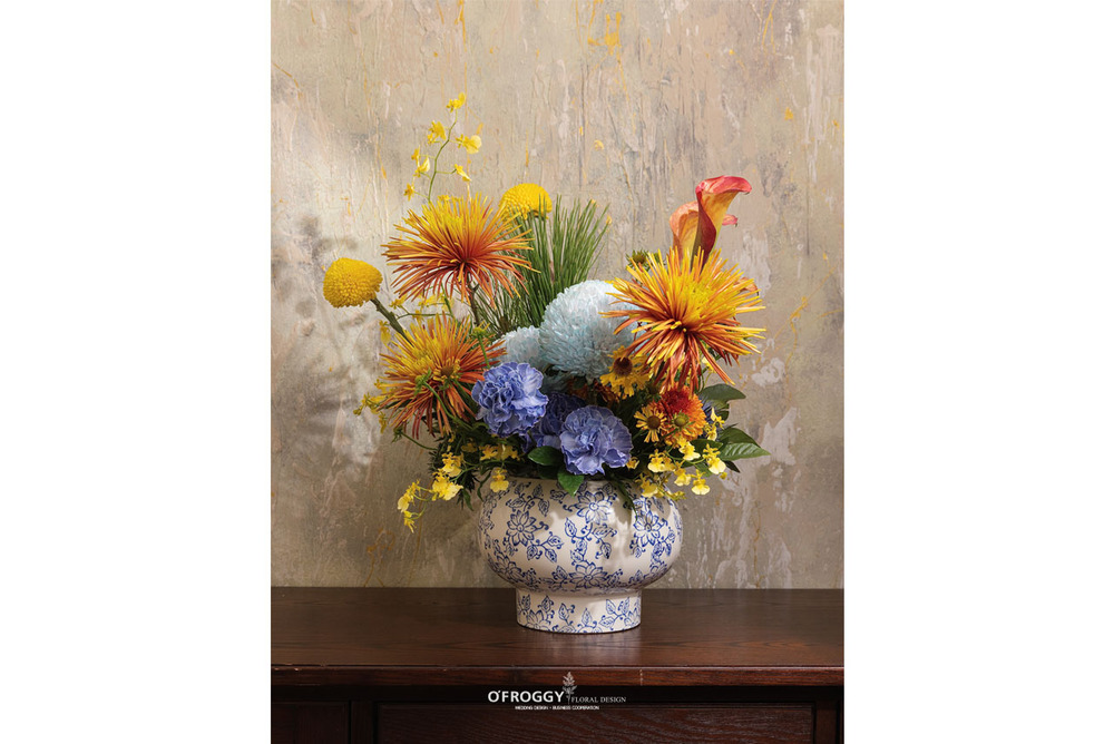 好蛙以青花器皿為底,搭配煙火菊與冰藍牡丹菊的層次,