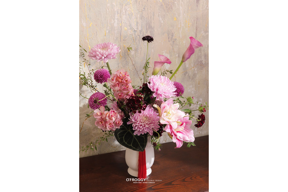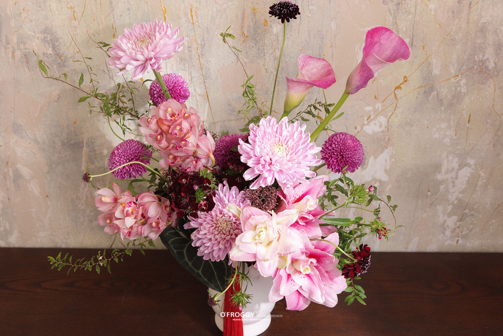 粉紫菊花盛放,搭配蘭花的細緻與粉百合的優雅,
